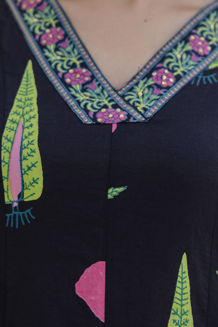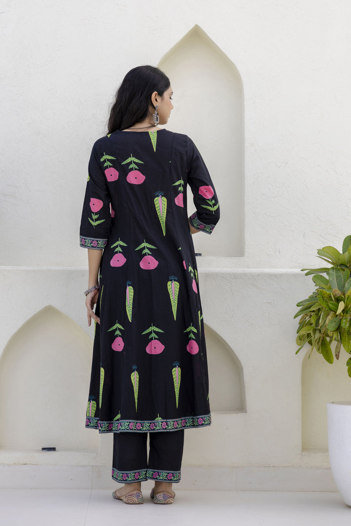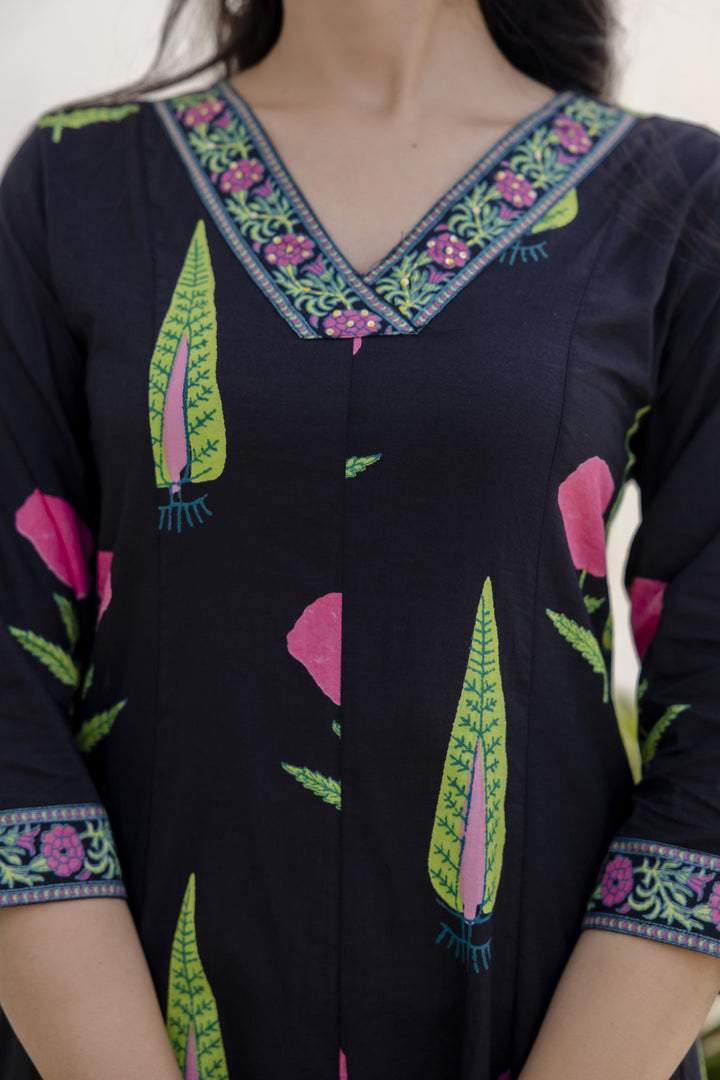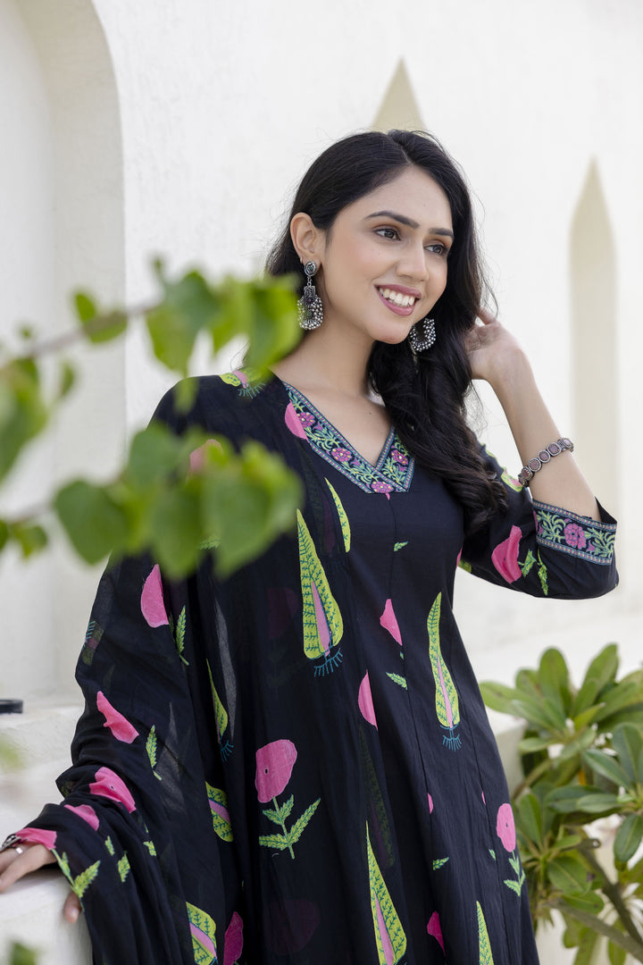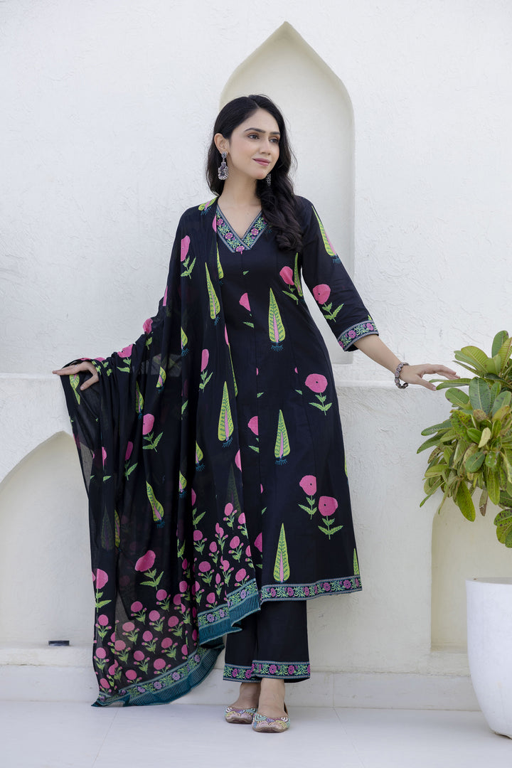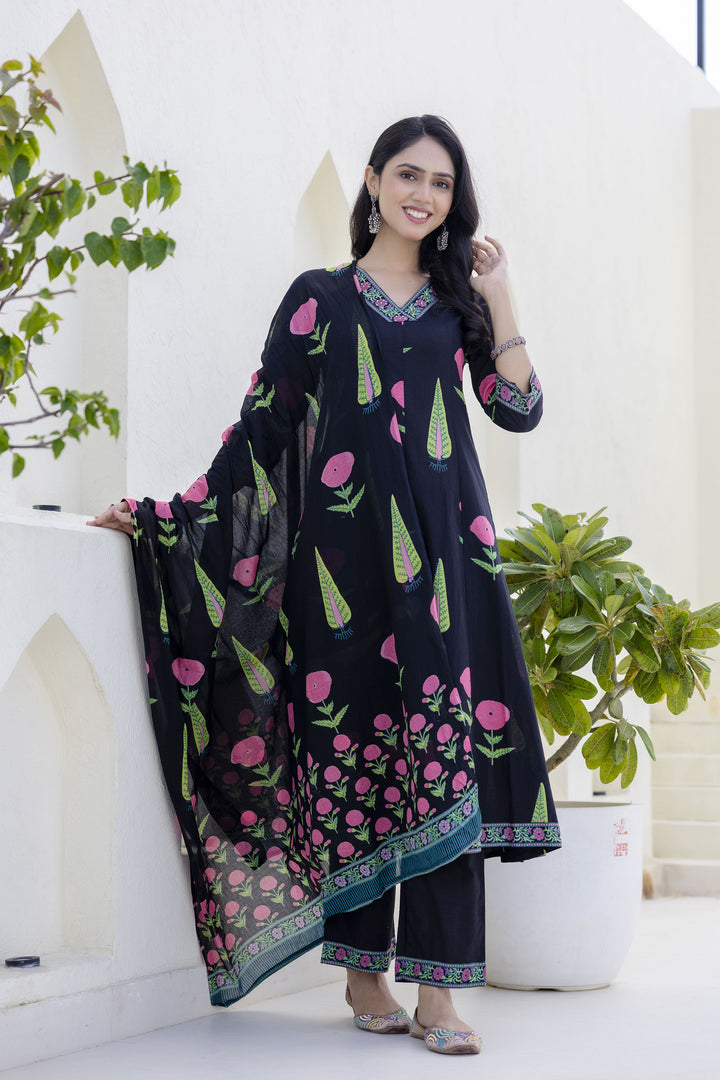 Myaza Floral Printed Kurta And Pant Dupatta Set With V Neck and 3/4th Sleeve and Calf Length