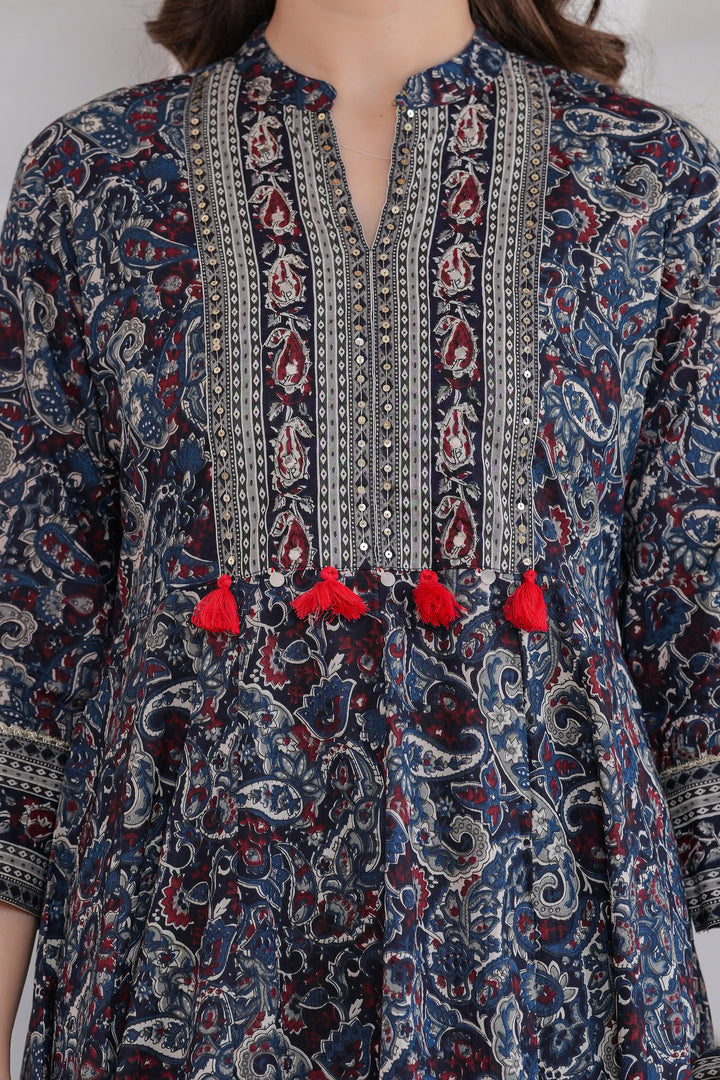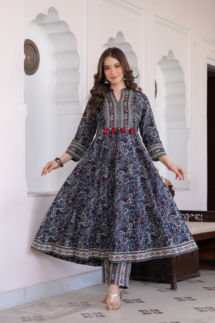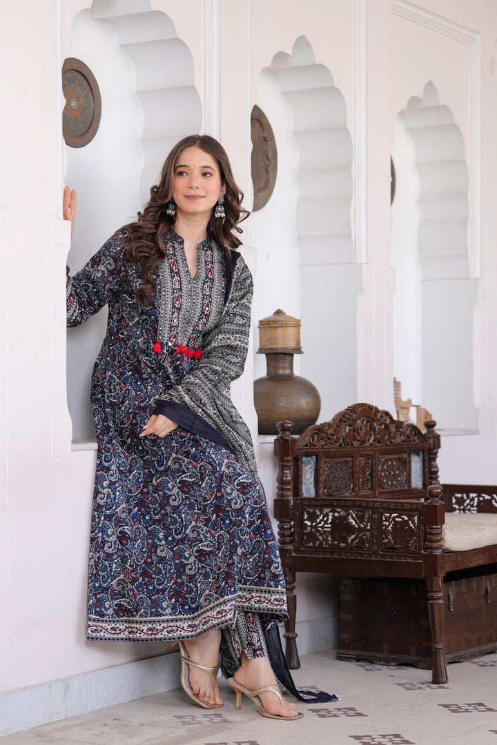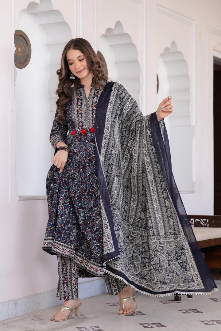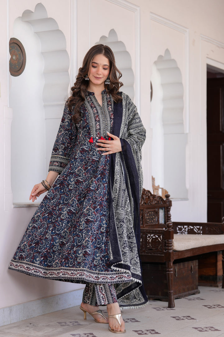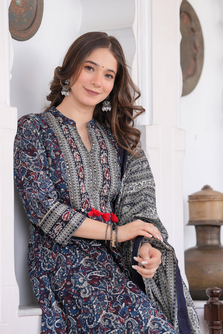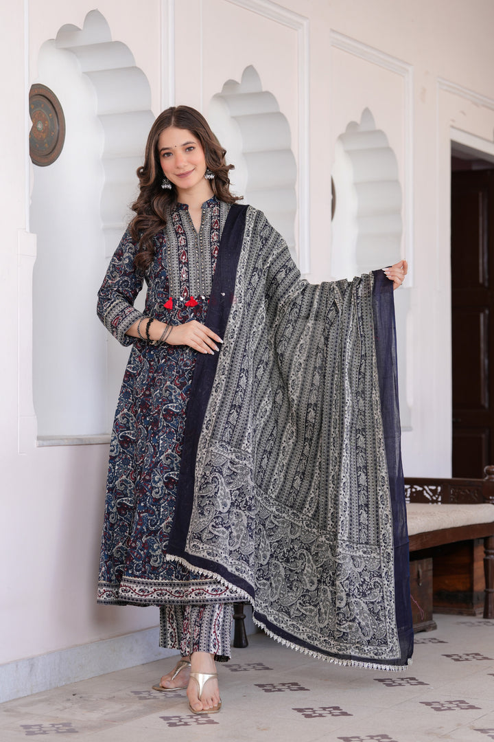 Blue Cotton Emb. Printed Kurta Pant Dupatta Set