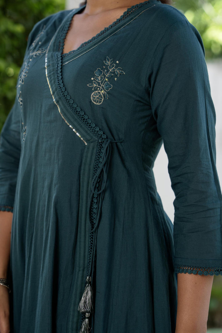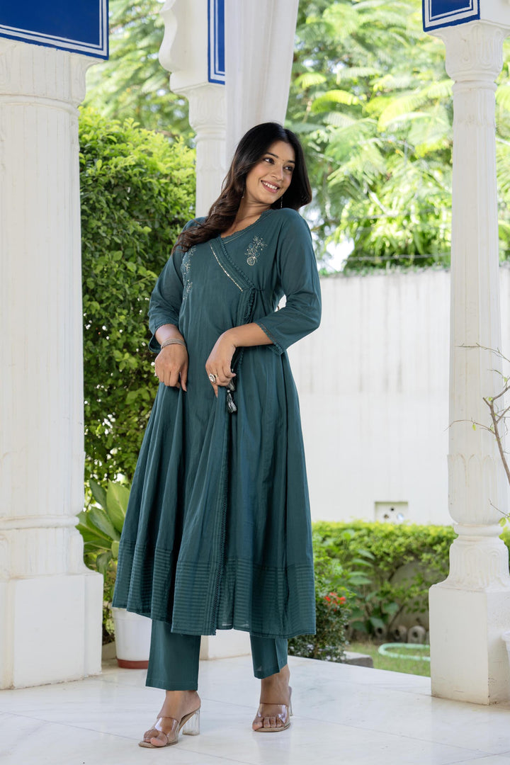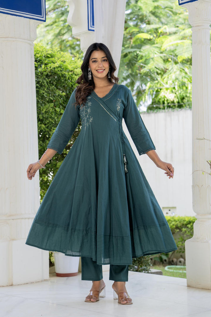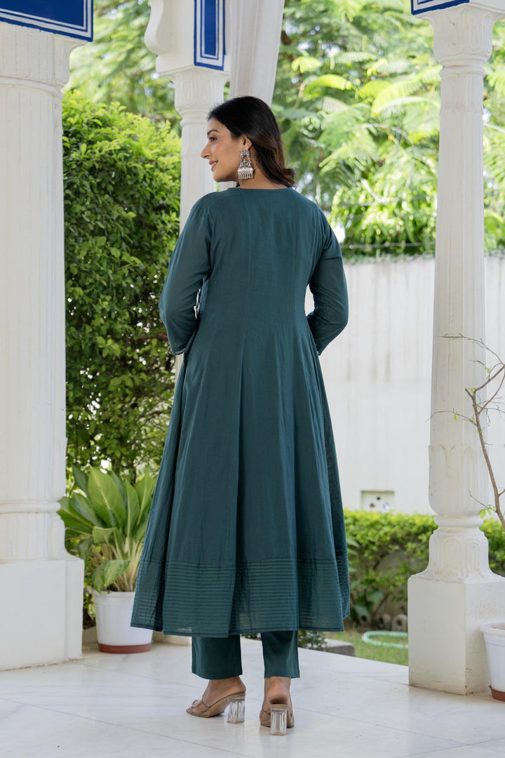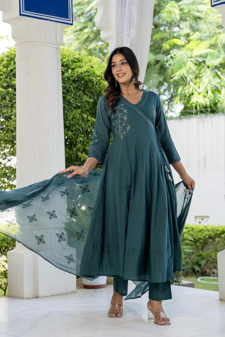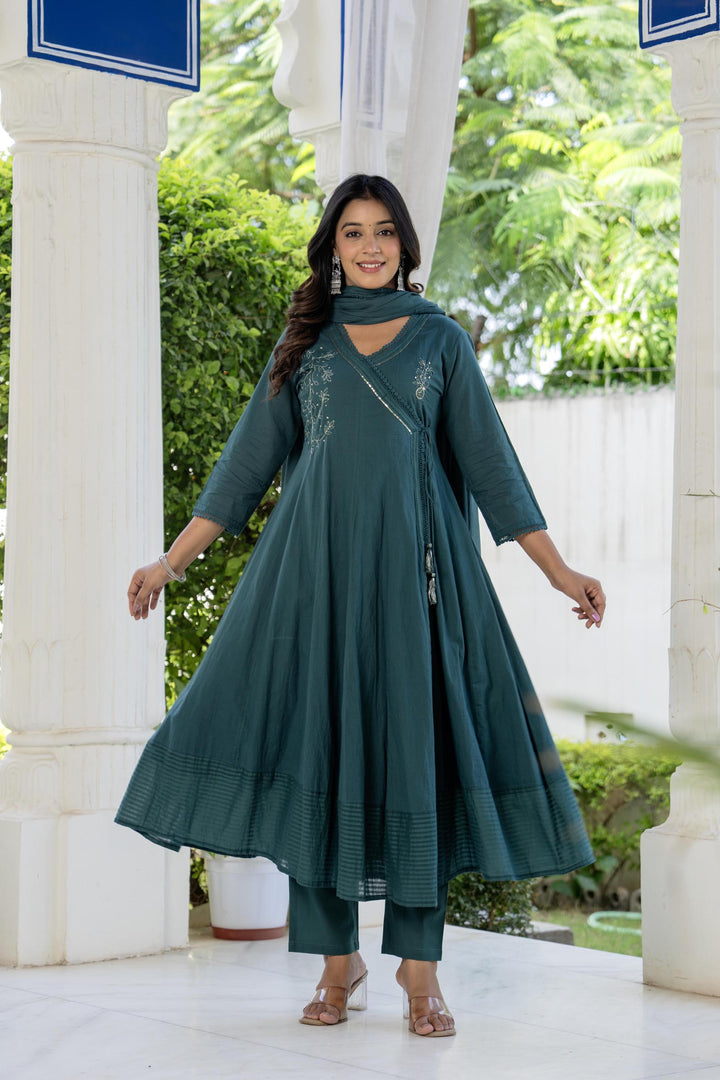 Myaza Women Cotton Solid Printed kUrta Pant Dupatta Set With Embroidered Anarkali Kurta With Lining And Round Neck With Calf Length Kurta