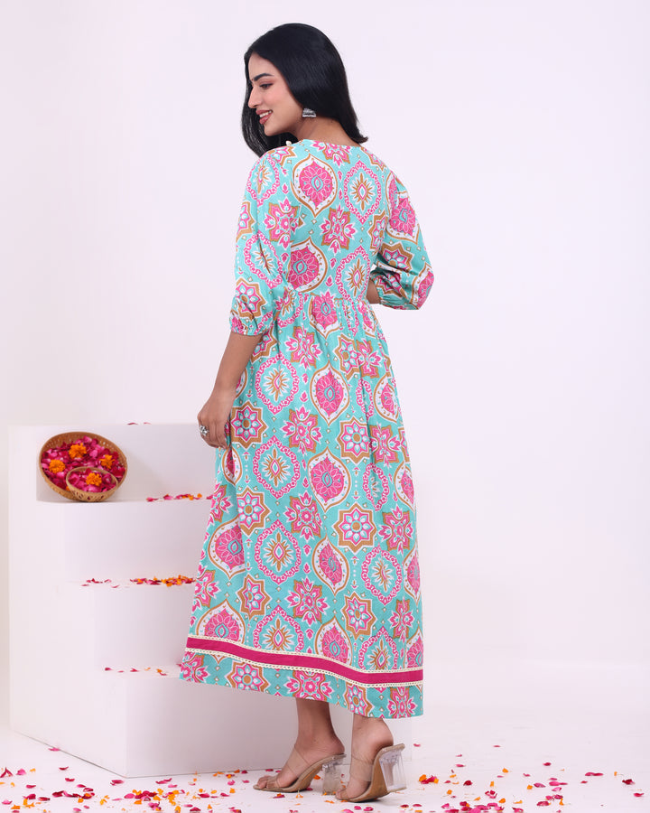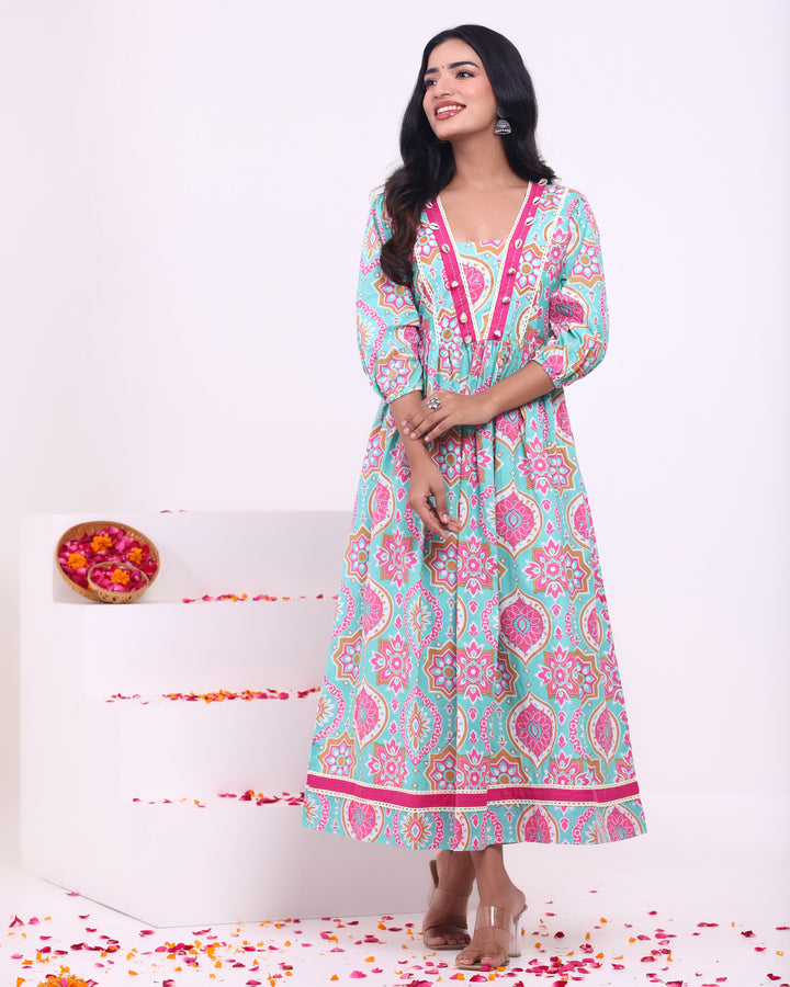 This sea green Anarkali kurta is a graceful blend of traditional charm and contemporary style. Crafted from breathable cotton fabric, it offers a comfortable fit perfect for warm weather. The calf-length cut and short sleeves provide a relaxed yet chic look, while the boat neck adds a stylish twist to the design. The kurta features a beautiful floral pattern that adds a fresh, feminine touch. Ideal for casual gatherings, festive occasions, or relaxed outings, this dress will effortlessly elevate your wardrobe with its timeless elegance.