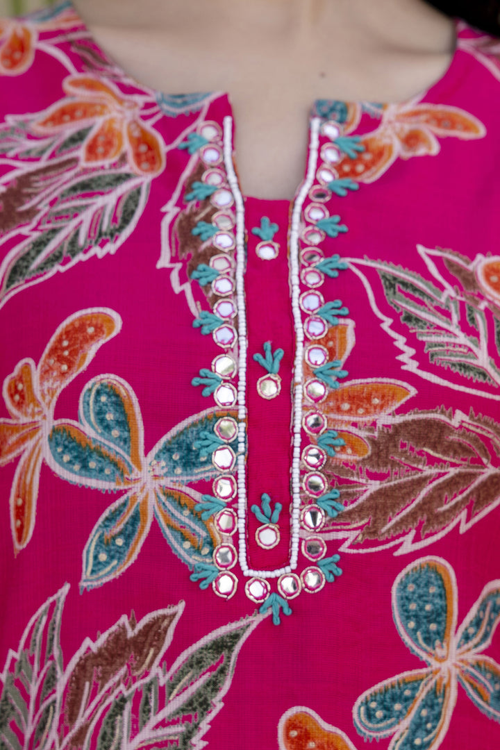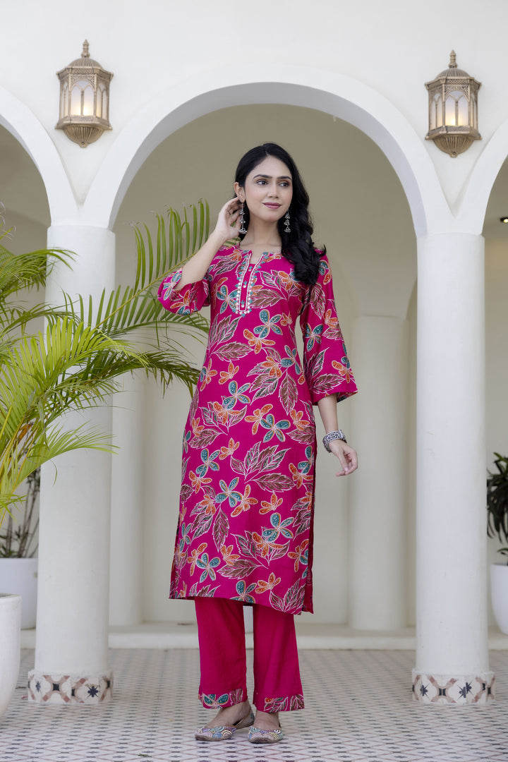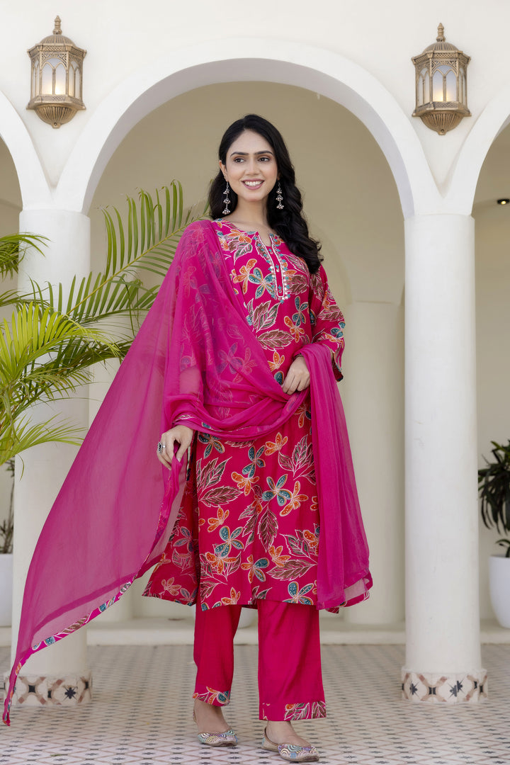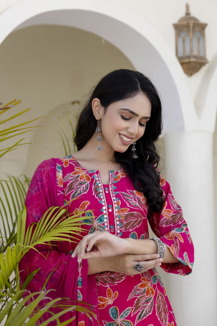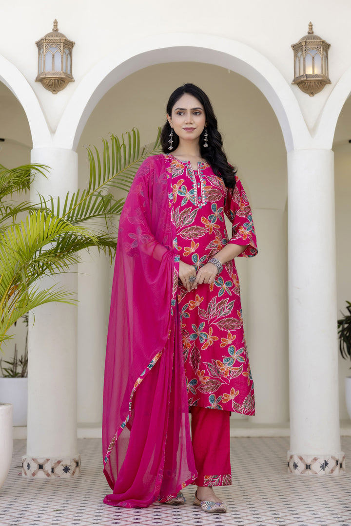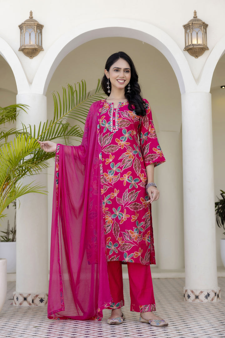 Myaza Floral Printed Kurta And Pant Dupatta Set With V Neck and 3/4th Sleeve and Calf Length