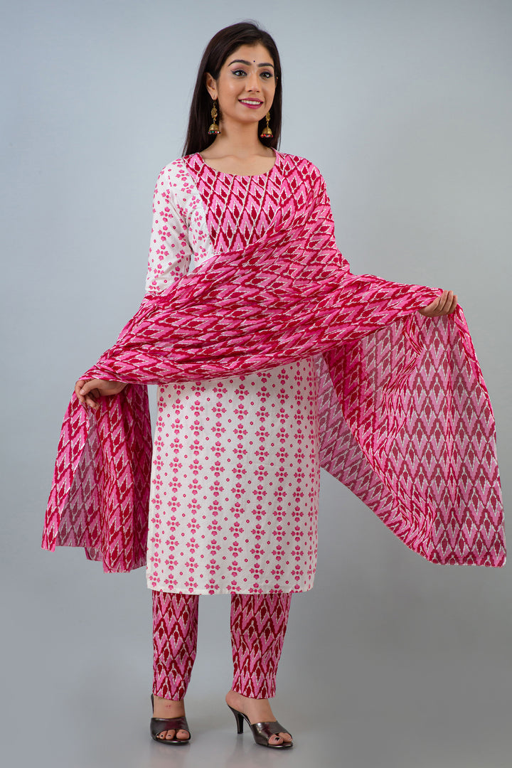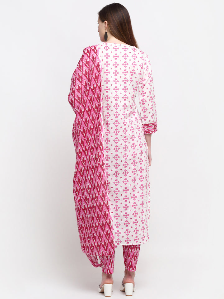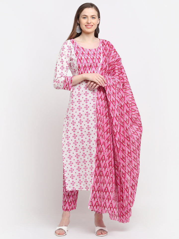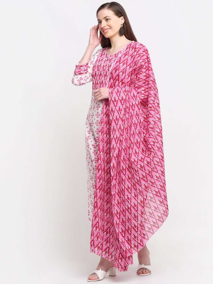 Myaza Floral Printed Kurta And Pant Dupatta Set With V Neck and 3/4th Sleeve and Calf Length