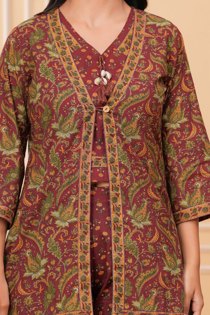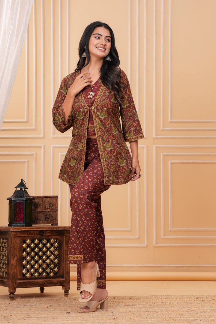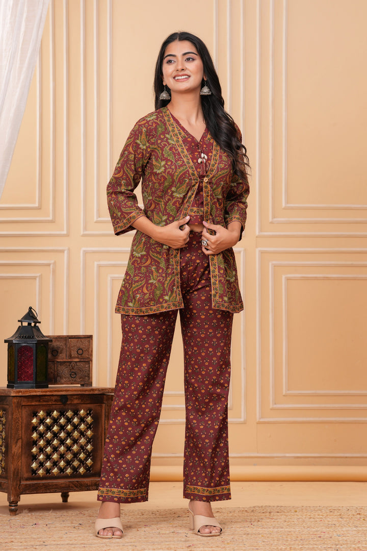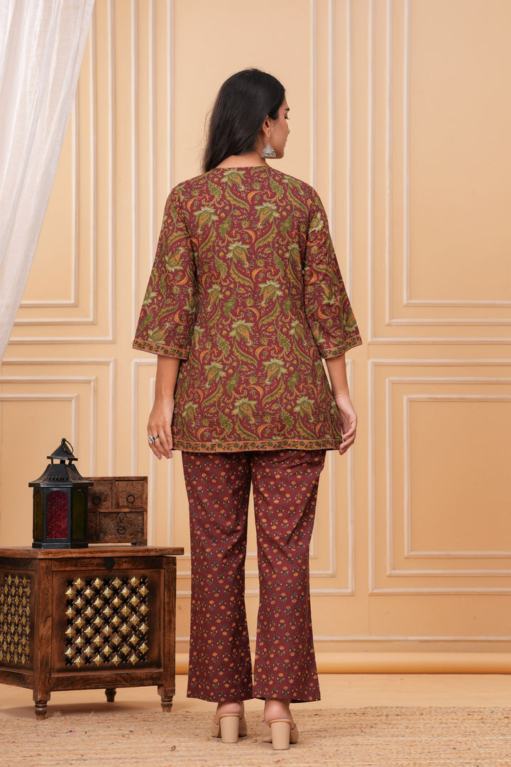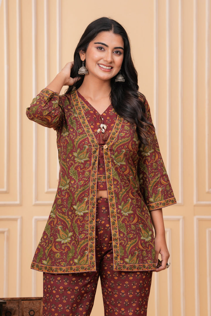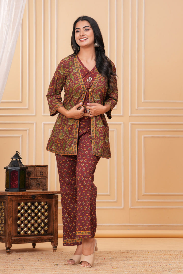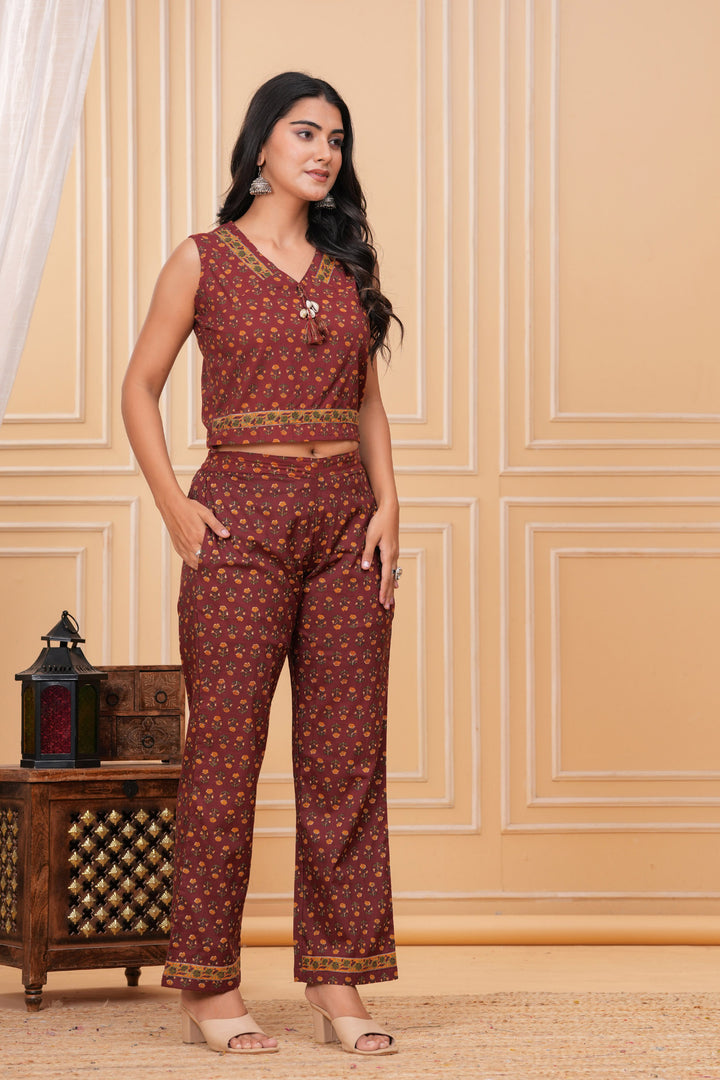 Myaza Women Maroon Flower Printed Co-Ord Set-M2254