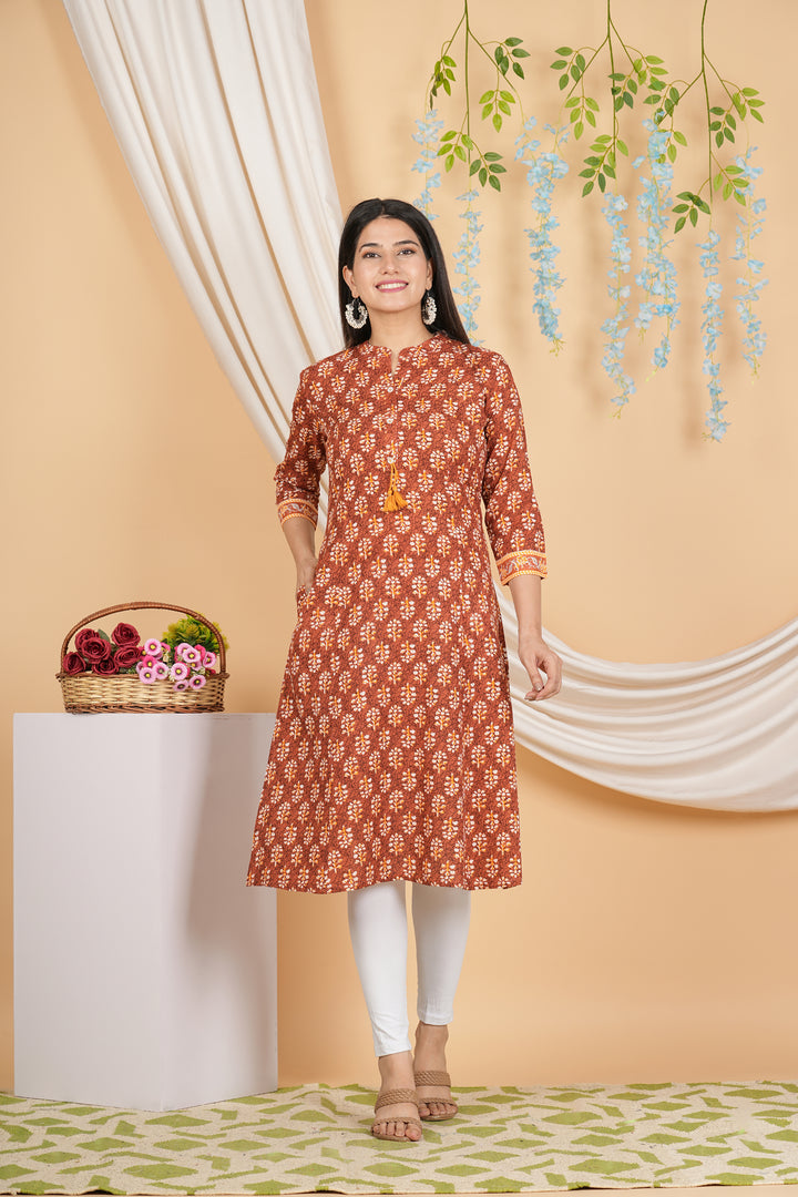 Women's Mustred Floral Floral Red Cotton Print Ethnic Dress Kurta