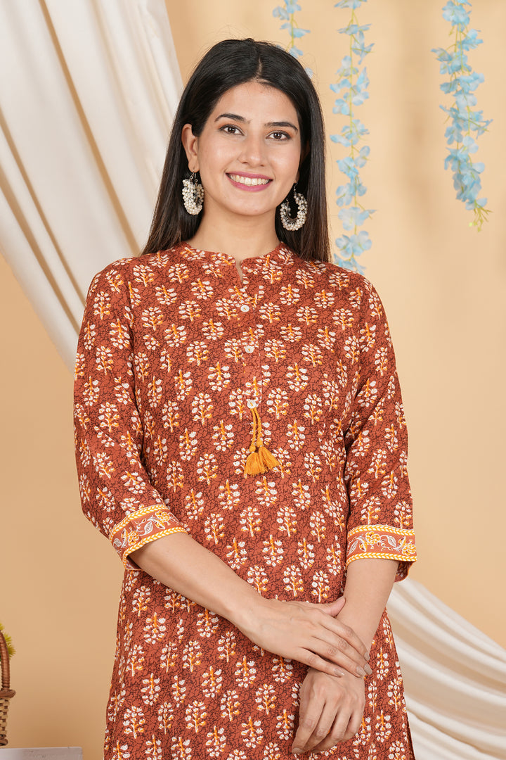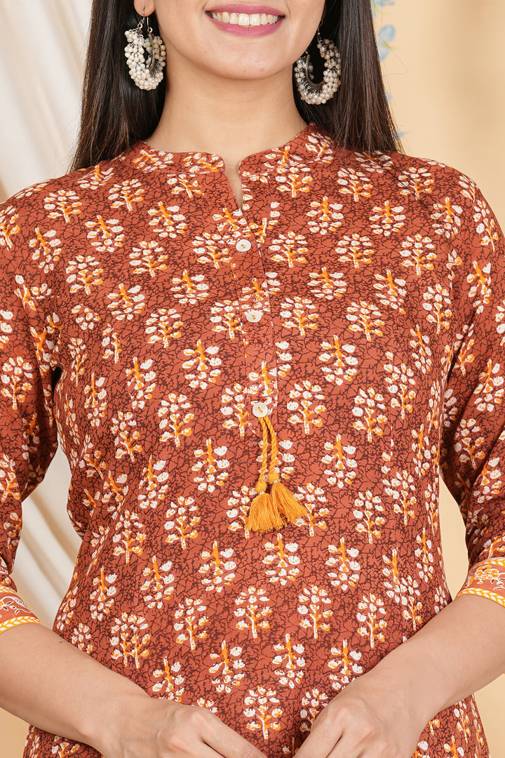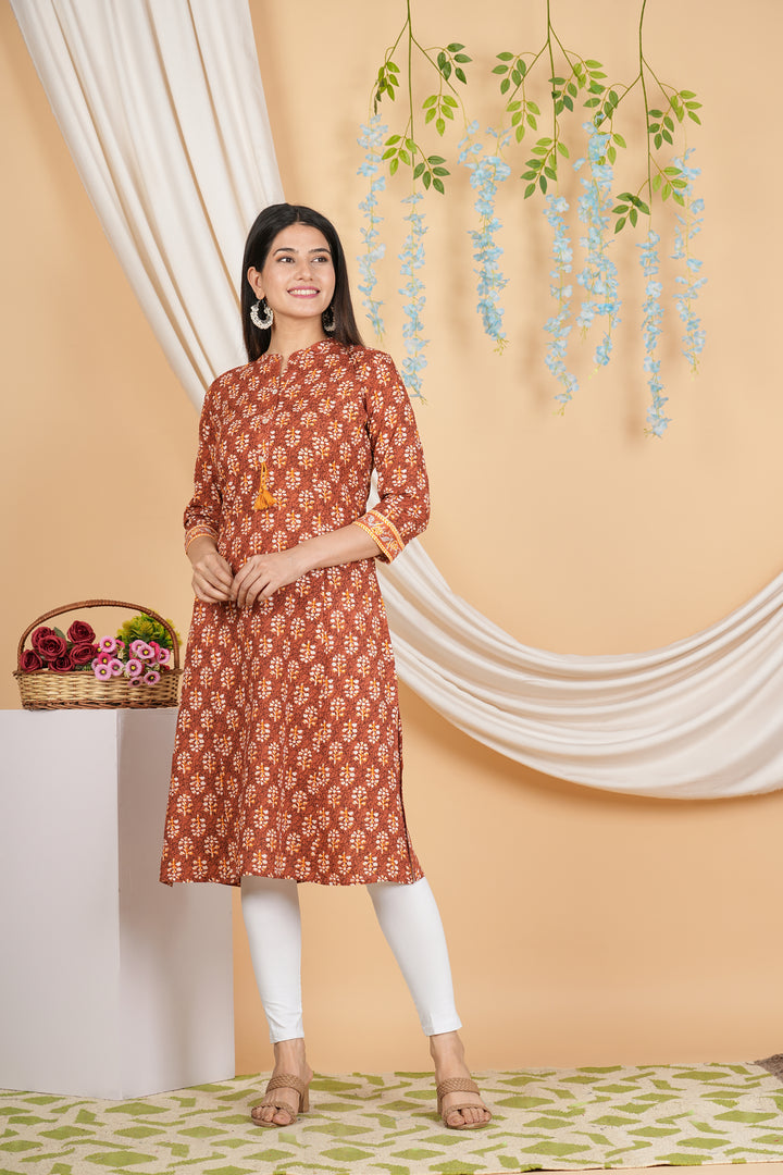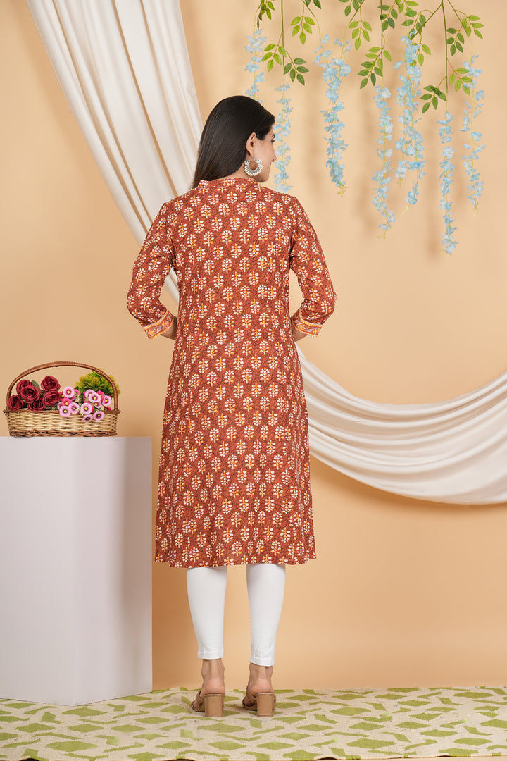 Featuring a charming floral pattern, this women’s Straight kurta adds a soft, feminine touch to your wardrobe. The delicate floral design brings a sense of vibrancy to this outfit, making it ideal for both casual and semi-formal occasions. And, its detailed yet simple print complements a range of accessories, allowing for versatile styling options.