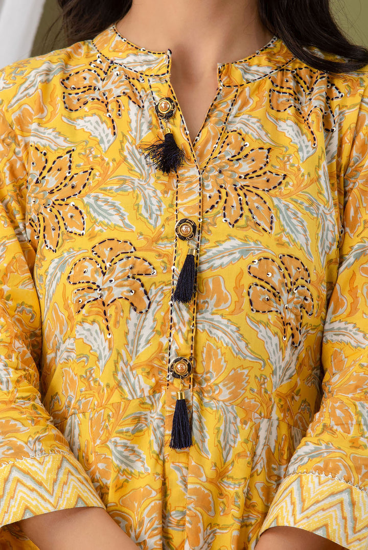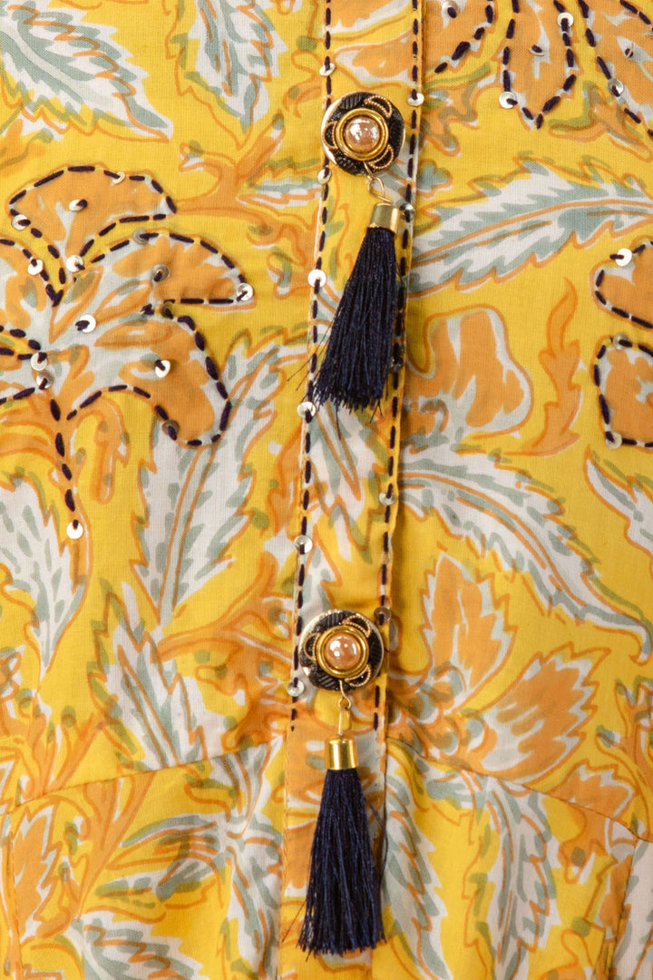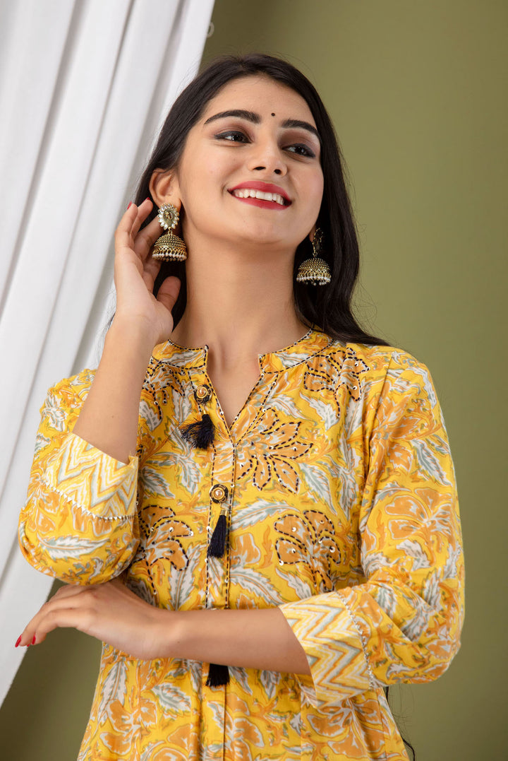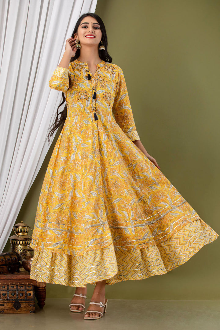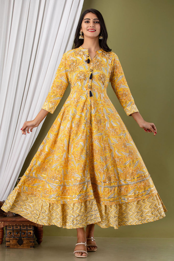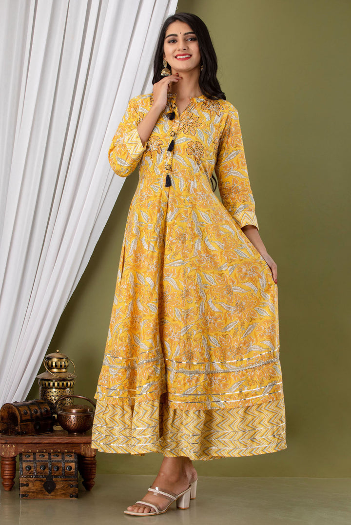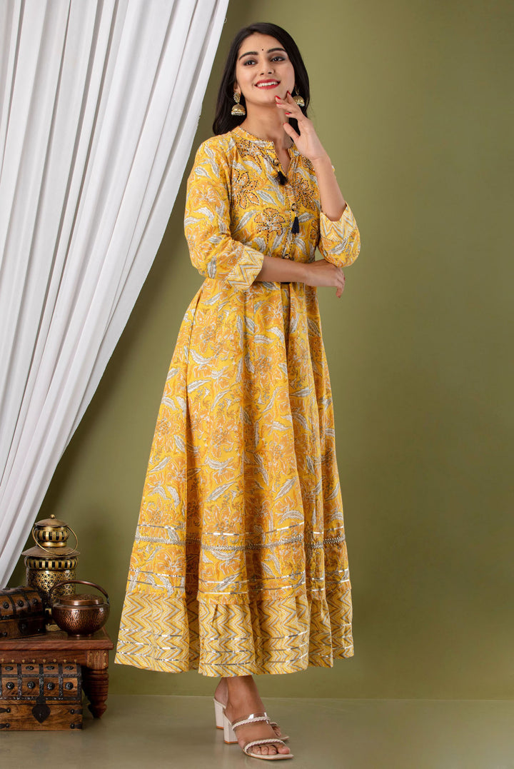 Women's Mustred Flower Yellow Cotton Printed Kurta Gown