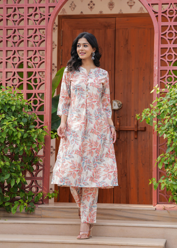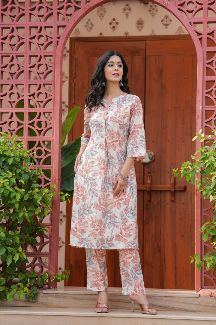 Elevate your ethnic wardrobe with this sophisticated peach flower printed kurta pant set. Crafted with meticulous attention to detail, the delicate floral motif brings a refined elegance to traditional silhouettes. The kurta features a comfortable, flowing fit that flatters all body types, while the coordinating pants ensure a polished, put-together appearance. Perfect for festive occasions, family gatherings, or everyday wear, this ensemble combines timeless design with contemporary comfort. The soft, breathable fabric makes it ideal for India's warm climate, allowing you to stay cool without compromising on style. A versatile piece that transitions seamlessly from day to evening celebrations.