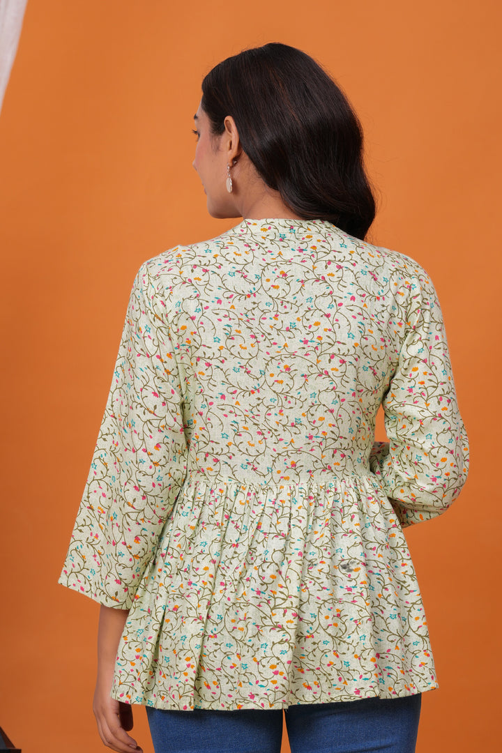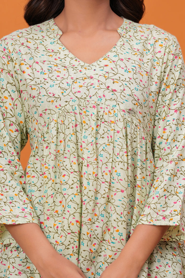 MYAZA COTTON Floral Printed Short Kurta Top for Women,Perfect for any occasion, this stylish piece is a must-have for every woman. Material: Crafted from premium-quality rayon for a soft and breathable feel. Design: Features a charming floral print that enhances your style. Neckline: Designed with a flattering V-neck. Fit: Short length and relaxed fit, perfect for pairing with jeans, leggings, or skirts.