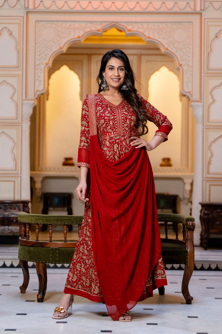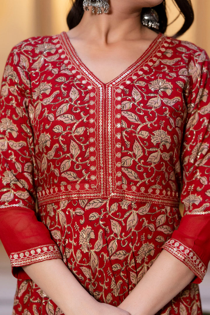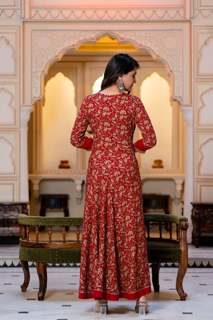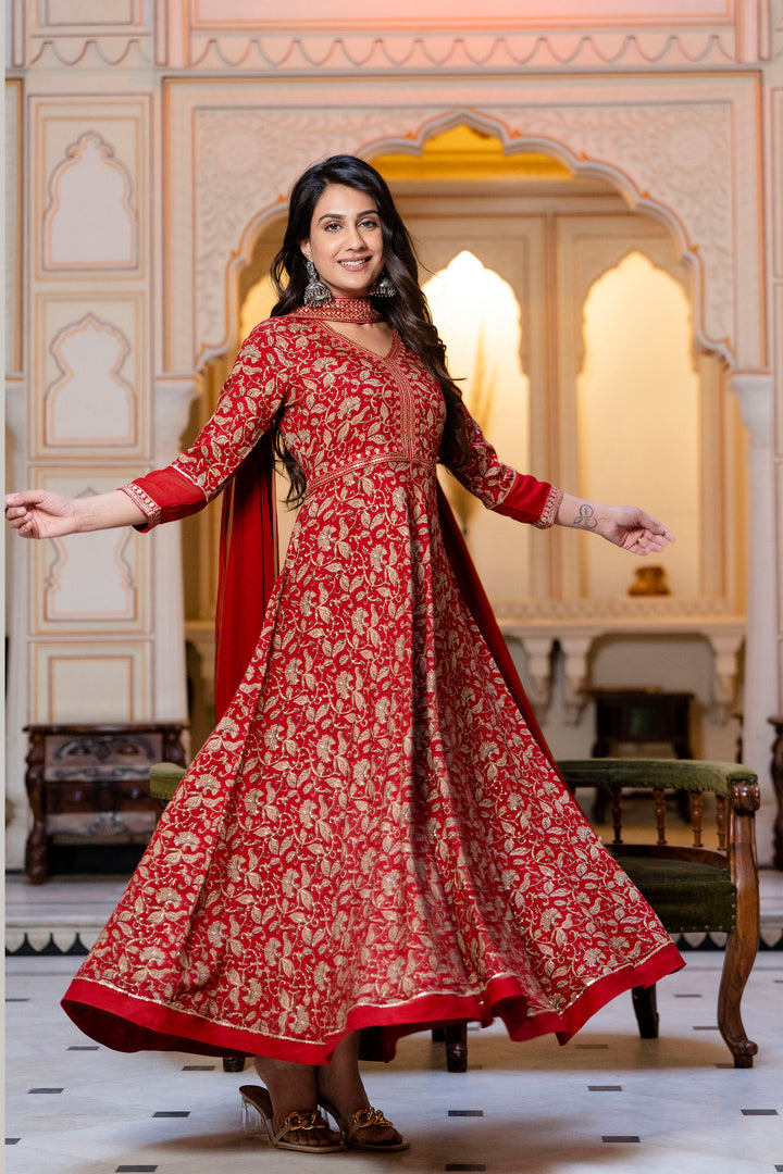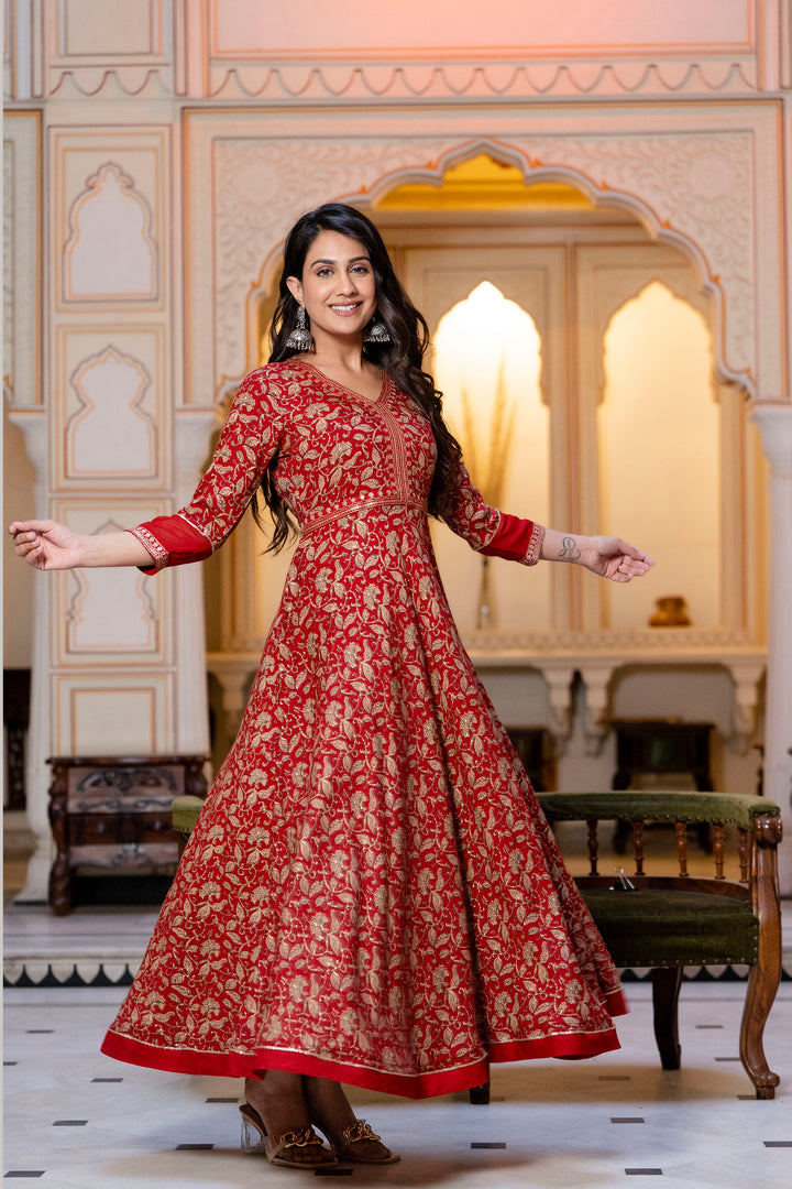 Women's Red Foil Red Rayon Printed Kurta Gown