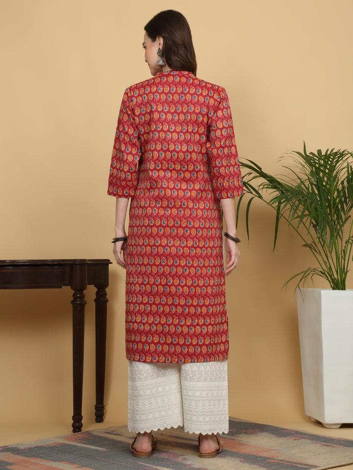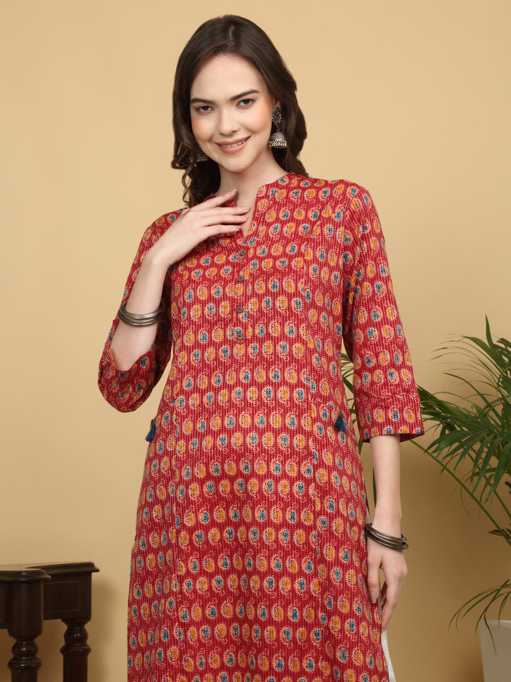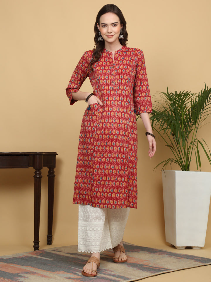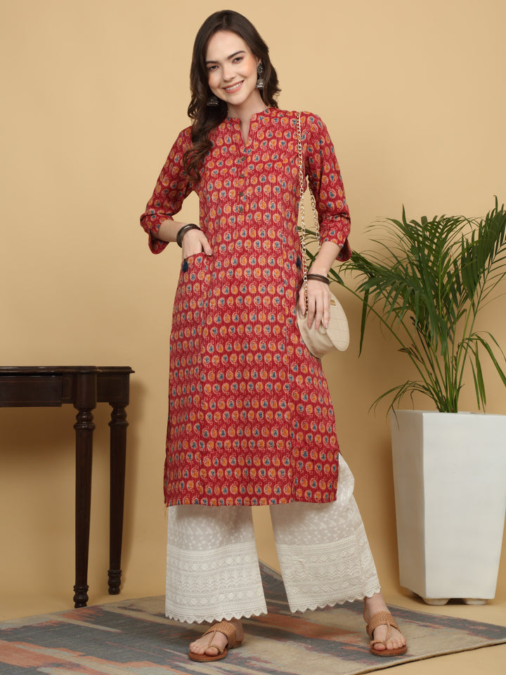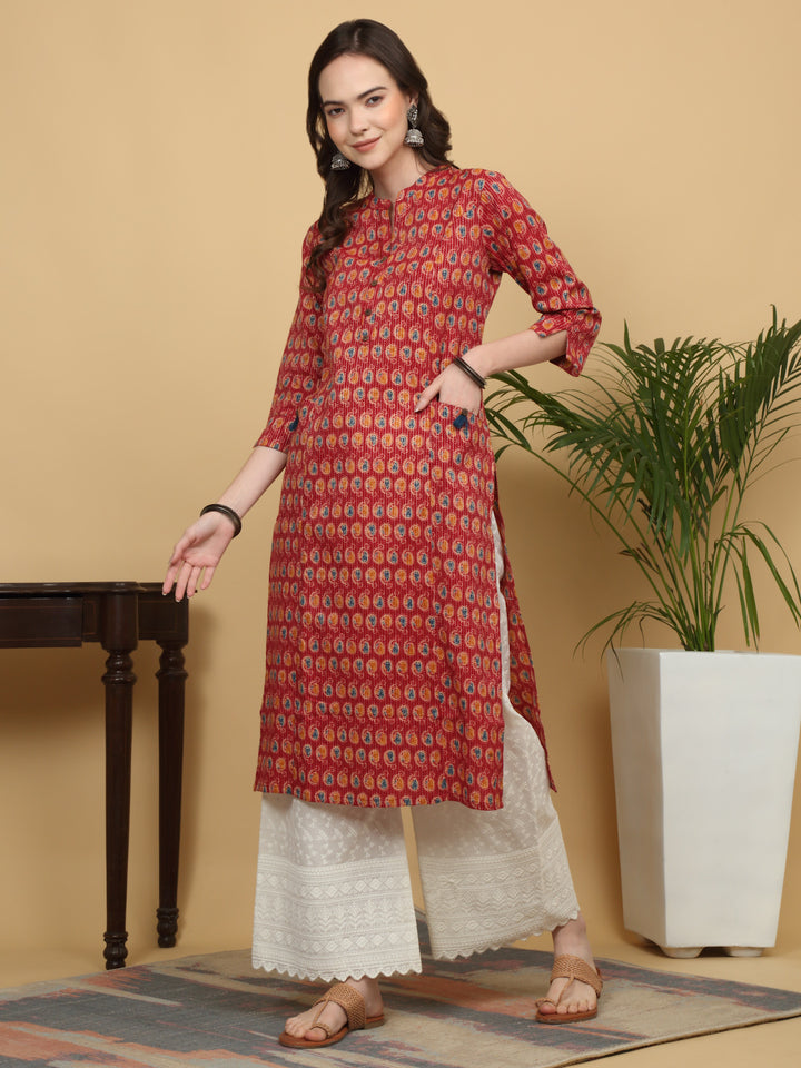 Featuring a charming floral pattern, this women’s Straight kurta adds a soft, feminine touch to your wardrobe. The delicate floral design brings a sense of vibrancy to this outfit, making it ideal for both casual and semi-formal occasions. And, its detailed yet simple print complements a range of accessories, allowing for versatile styling options.