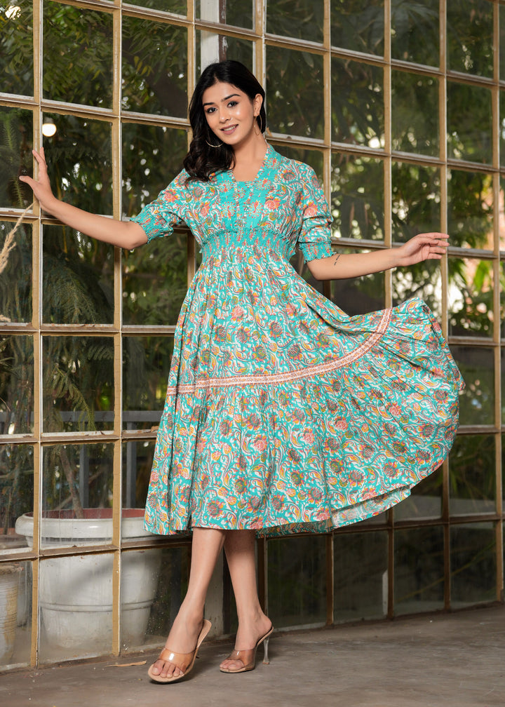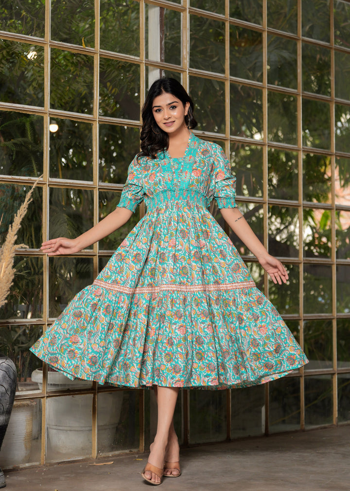 This sea green Anarkali kurta is a graceful blend of traditional charm and contemporary style. Crafted from breathable cotton fabric, it offers a comfortable fit perfect for warm weather. The calf-length cut and short sleeves provide a relaxed yet chic look, while the boat neck adds a stylish twist to the design. The kurta features a beautiful floral pattern that adds a fresh, feminine touch. Ideal for casual gatherings, festive occasions, or relaxed outings, this dress will effortlessly elevate your wardrobe with its timeless elegance.