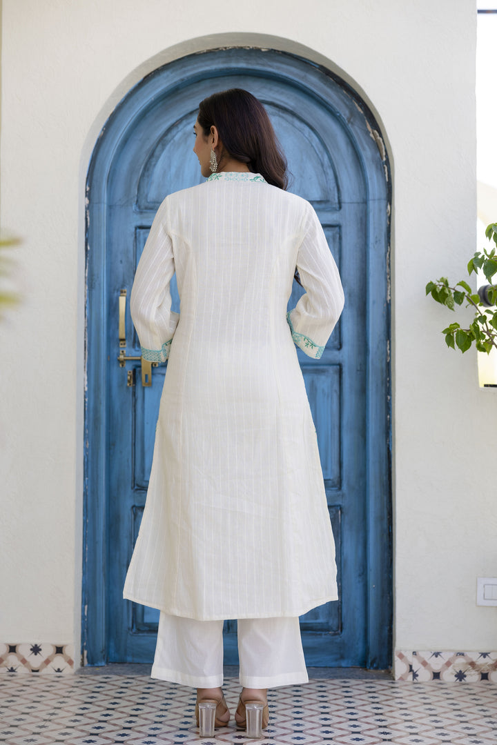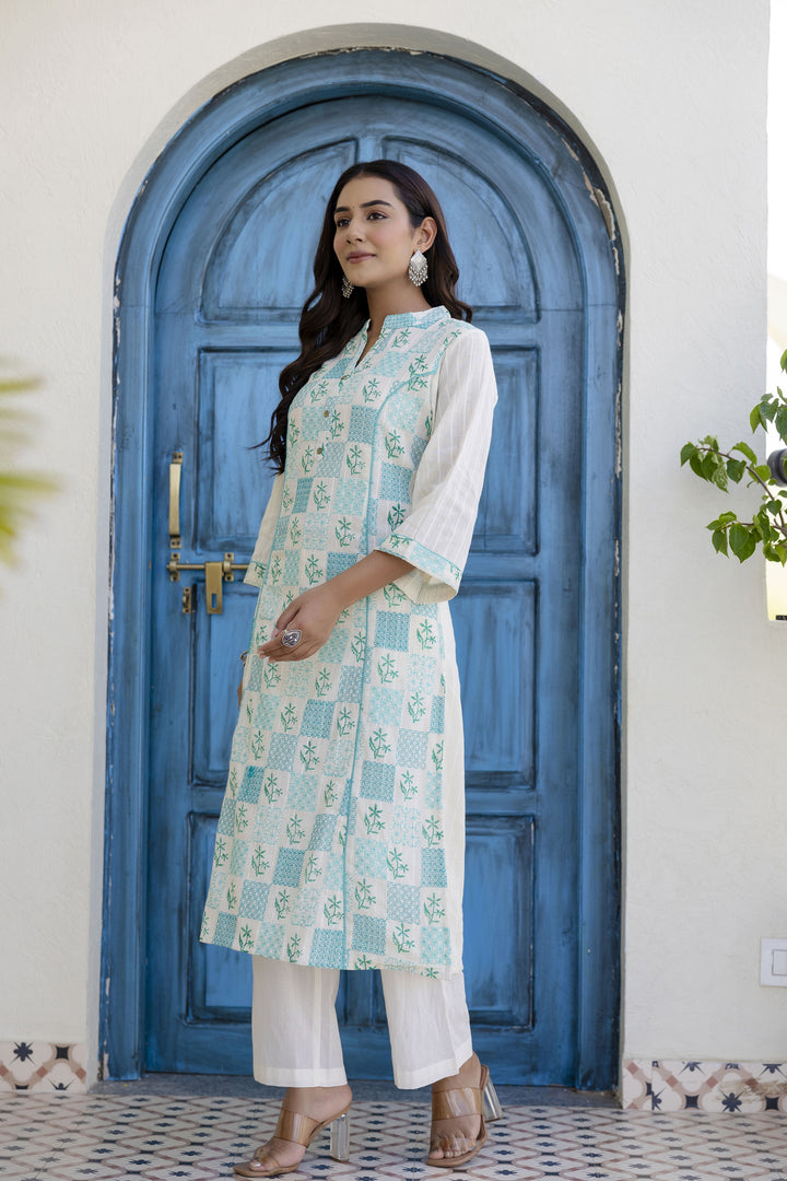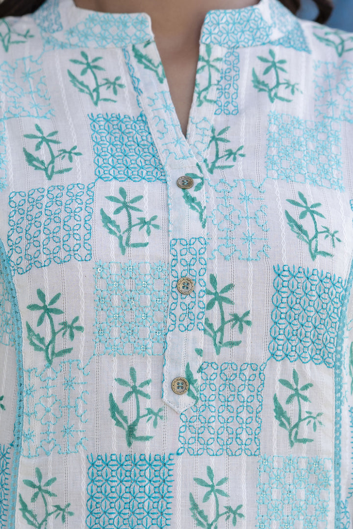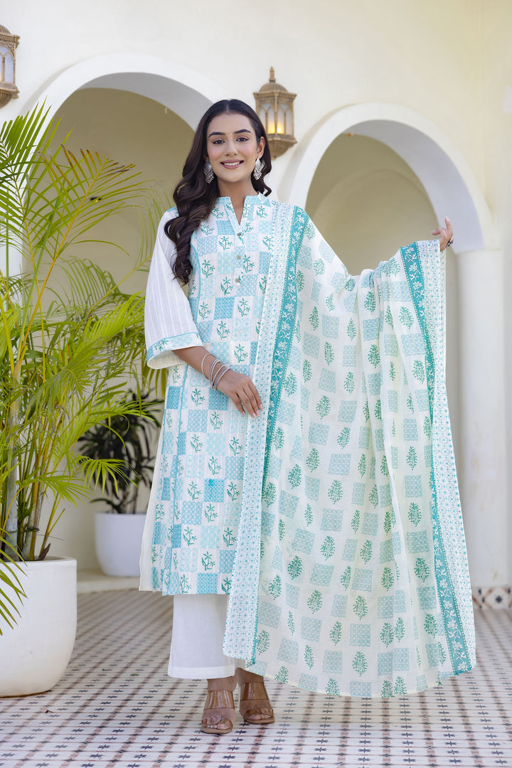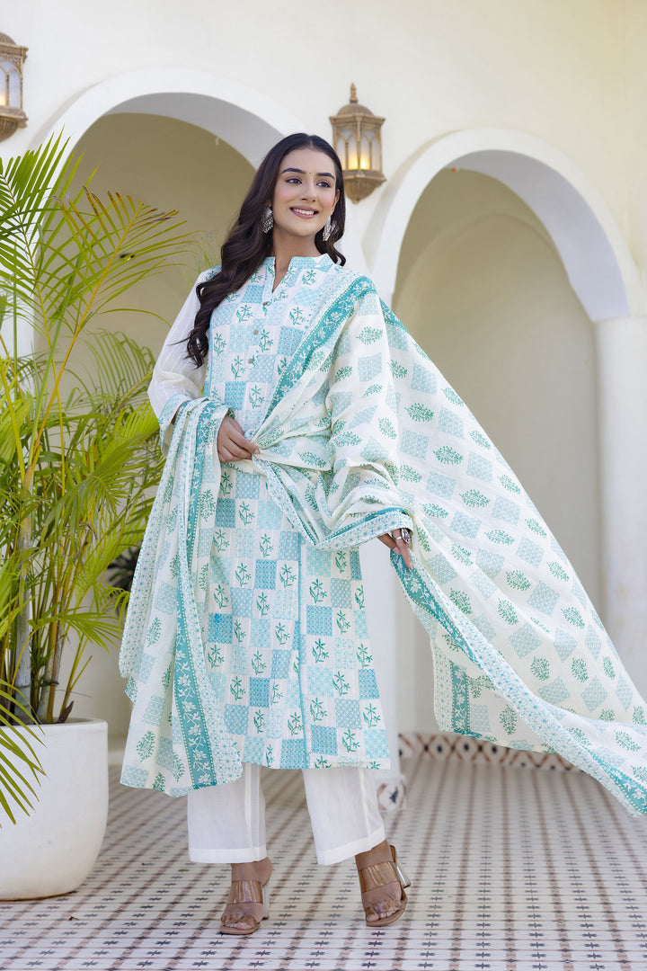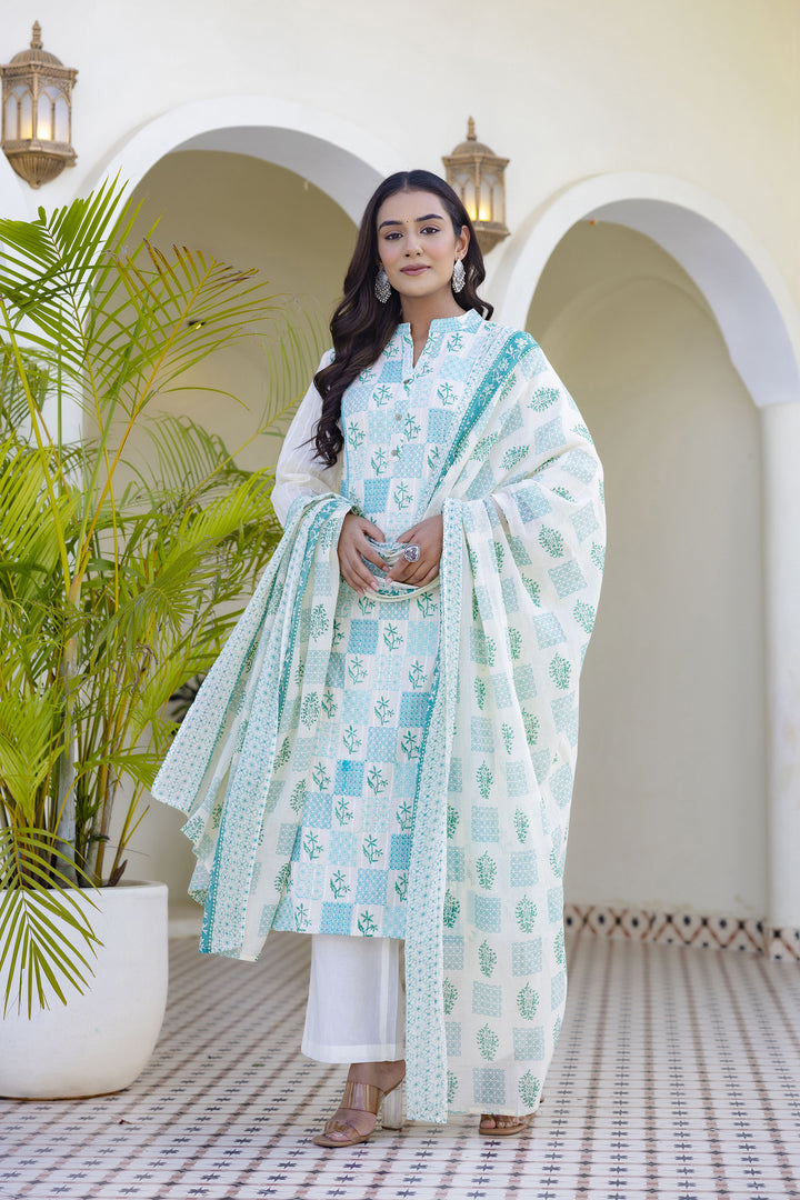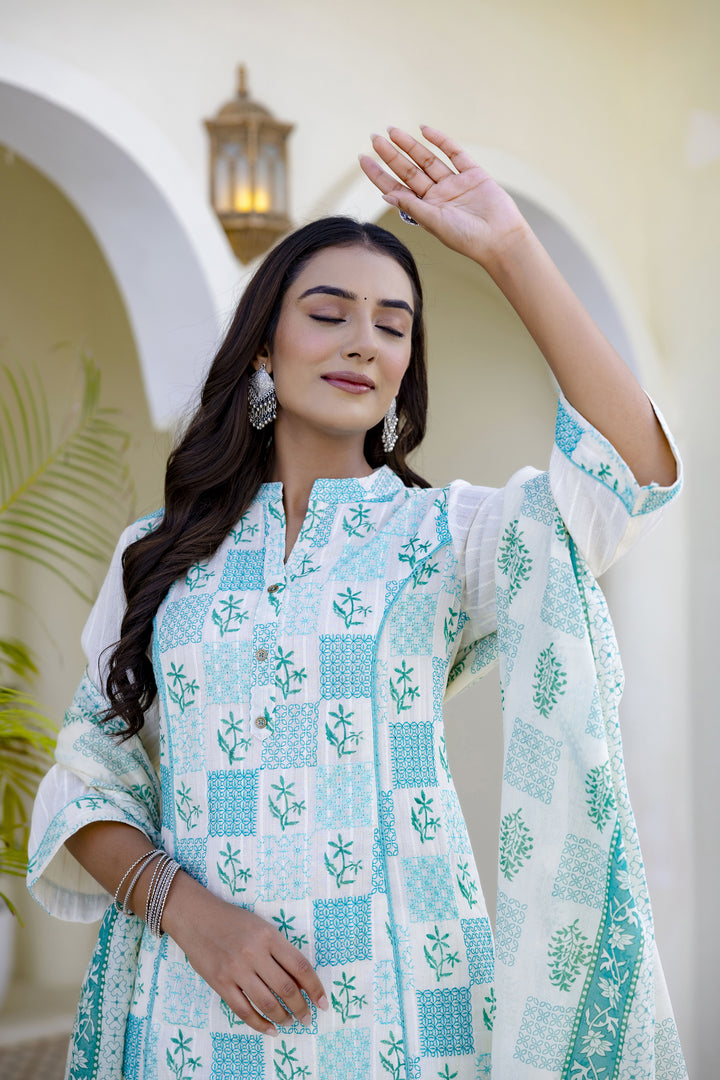 Blue Embroidary Cotton Kurta Pant Dupatta Set