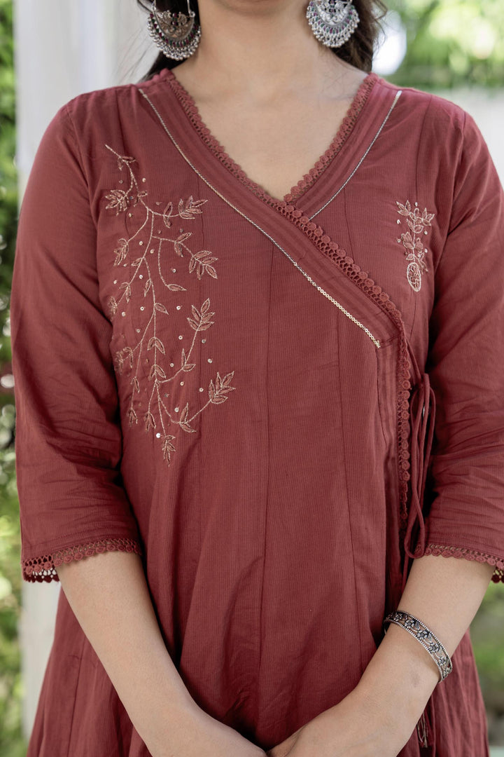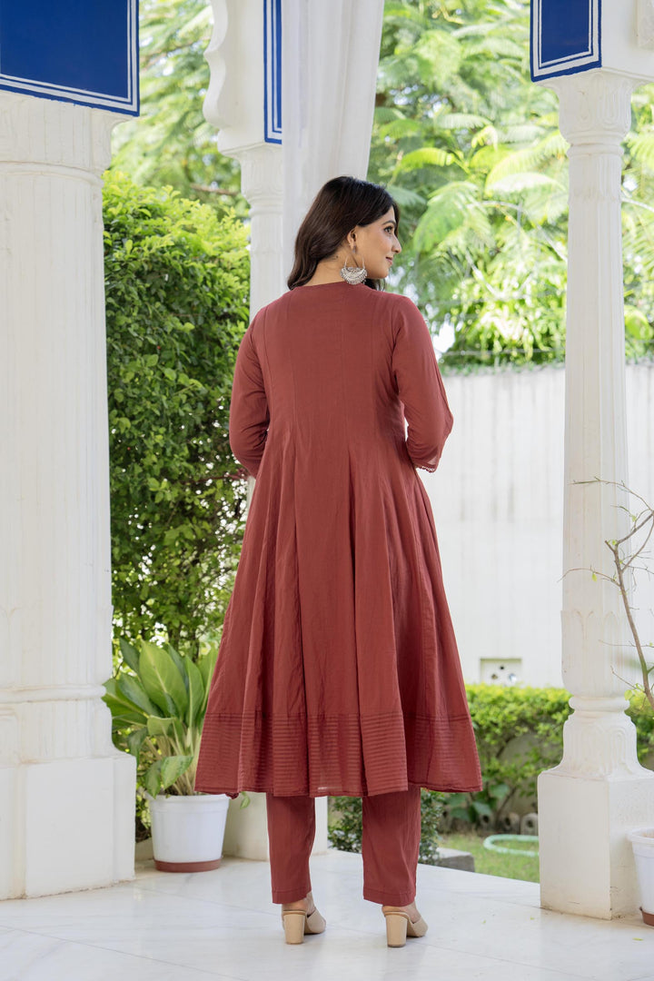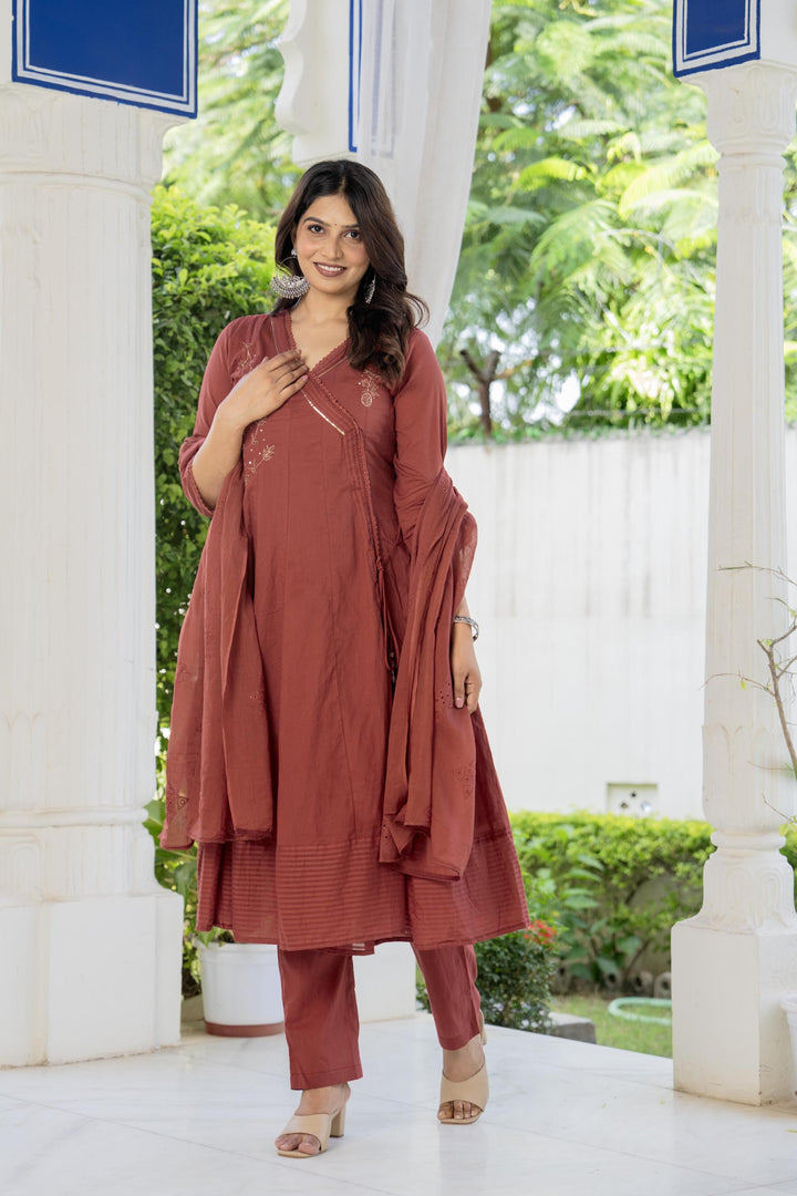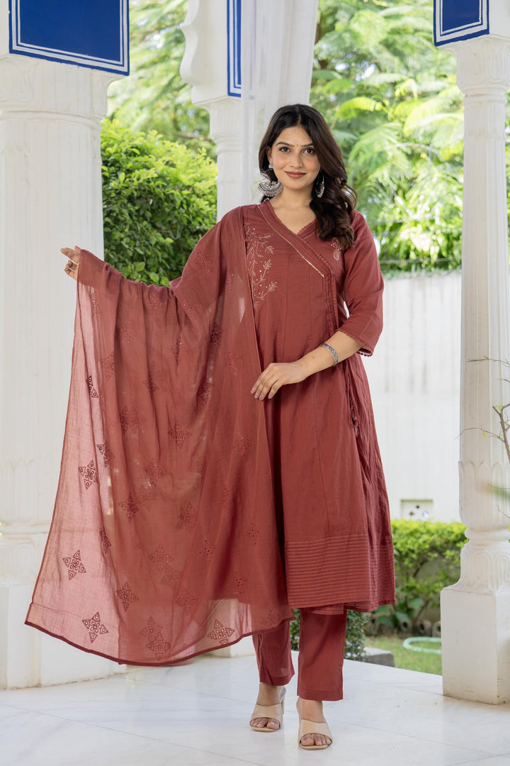 Myaza Women Cotton Solid Printed kUrta Pant Dupatta Set With Embroidered Anarkali Kurta With Lining And Round Neck With Calf Length Kurta