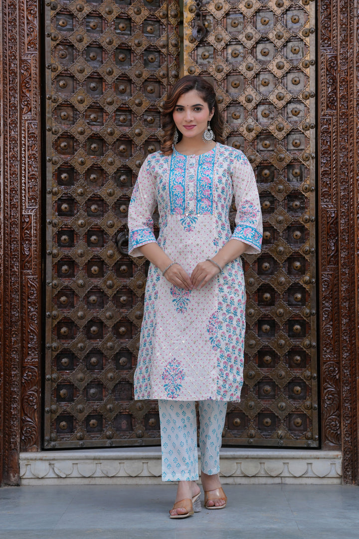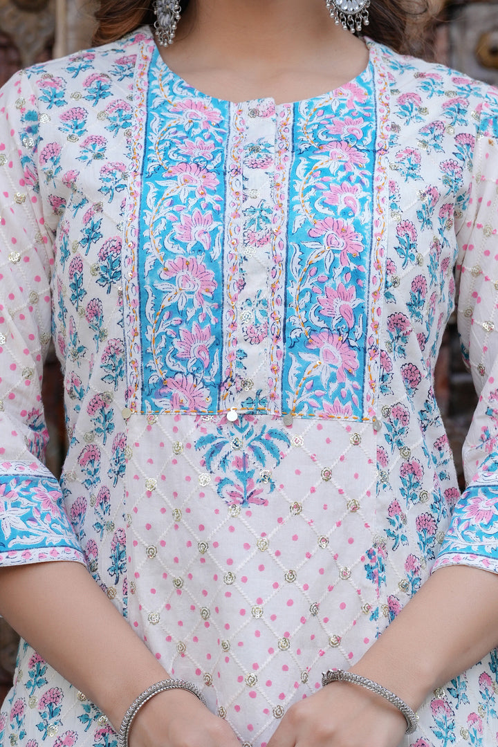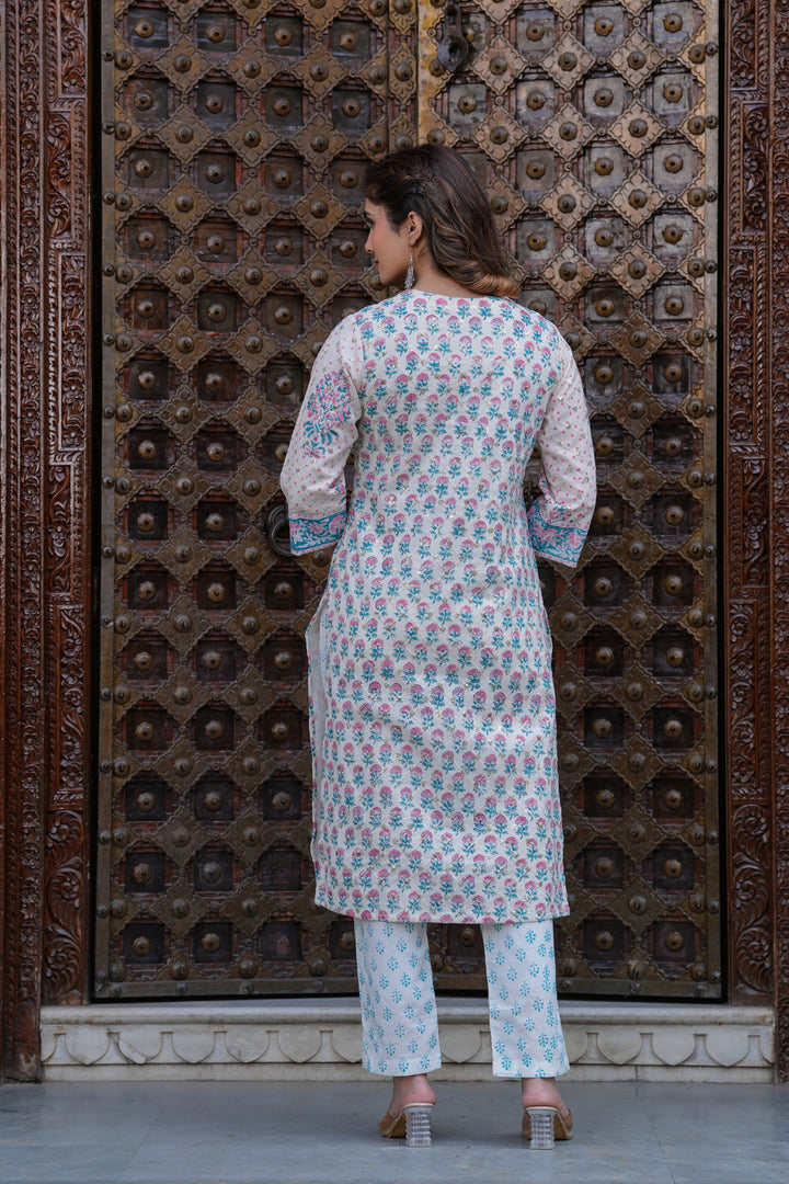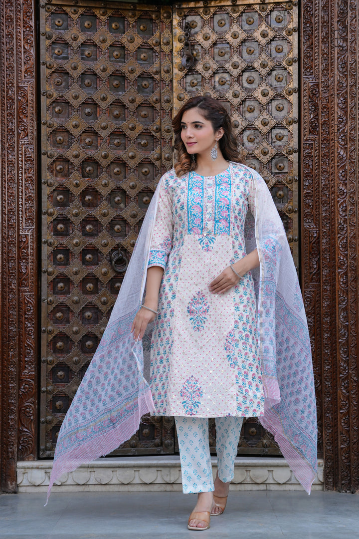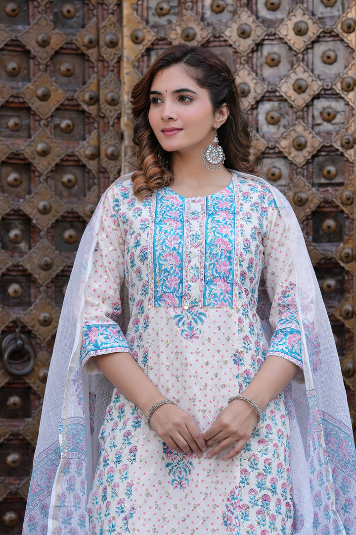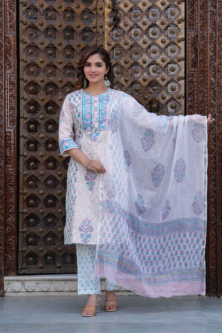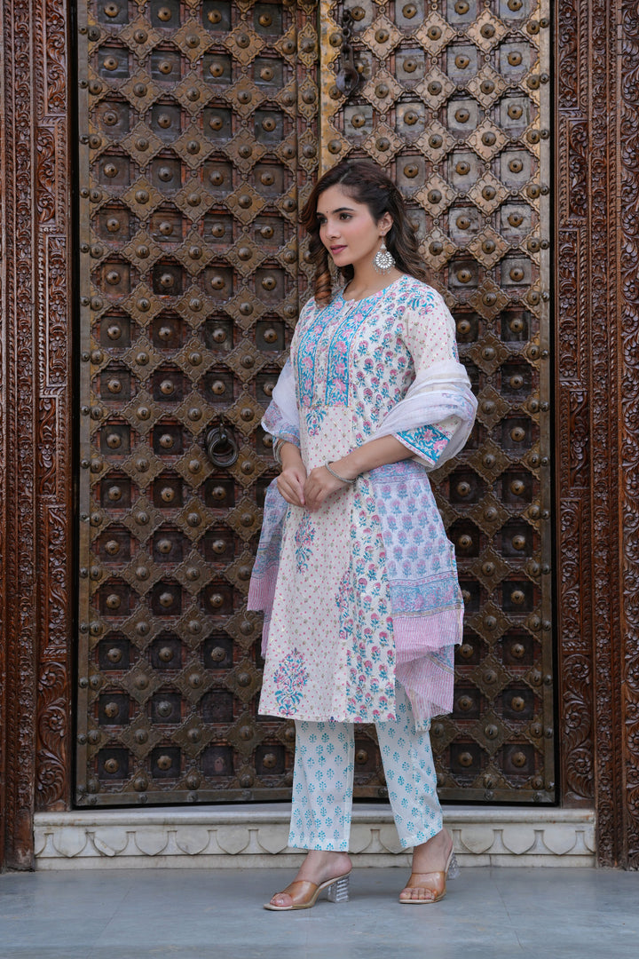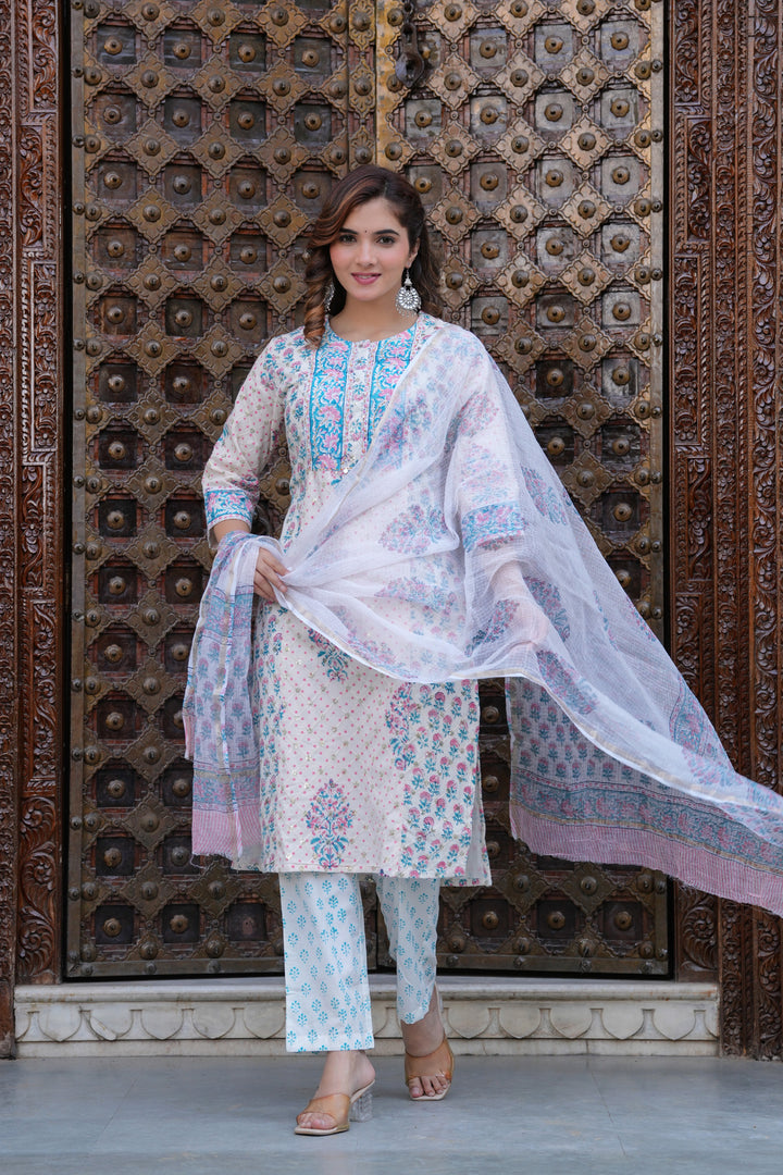 Myaza Floral Printed Kurta And Pant Dupatta Set With V Neck and 3/4th Sleeve and Calf Length