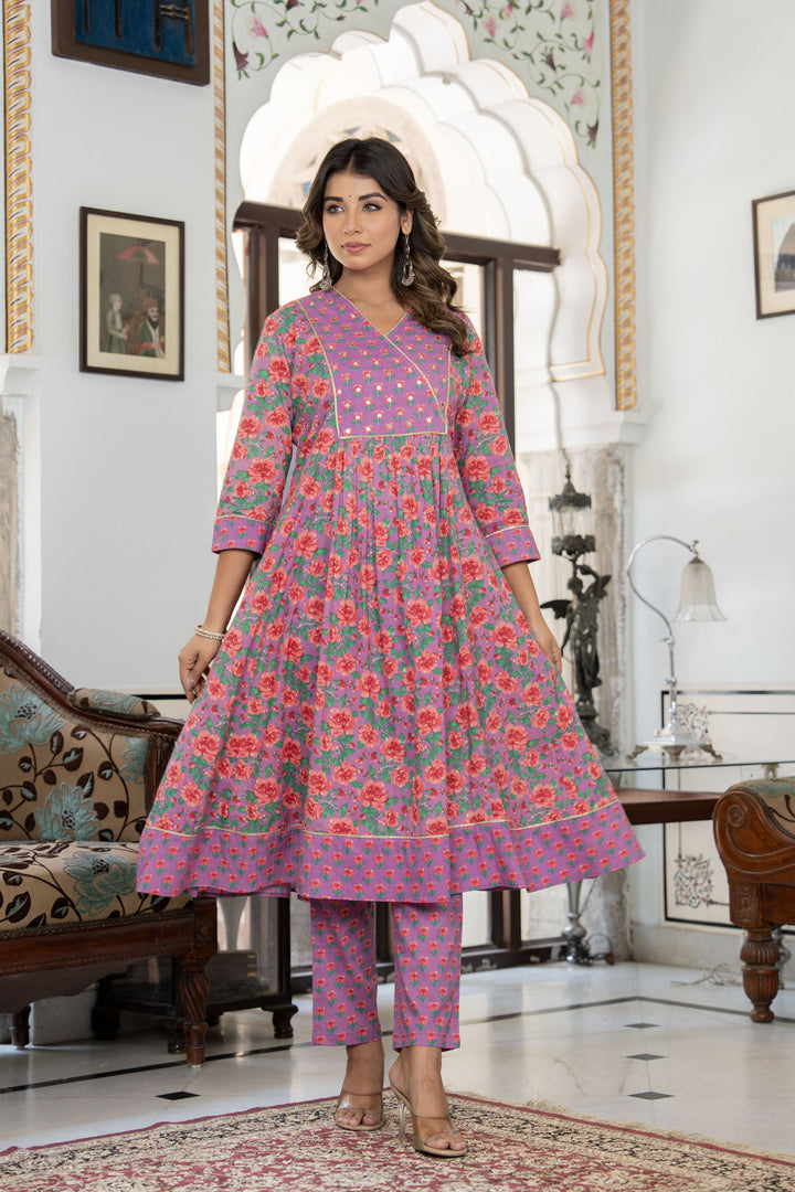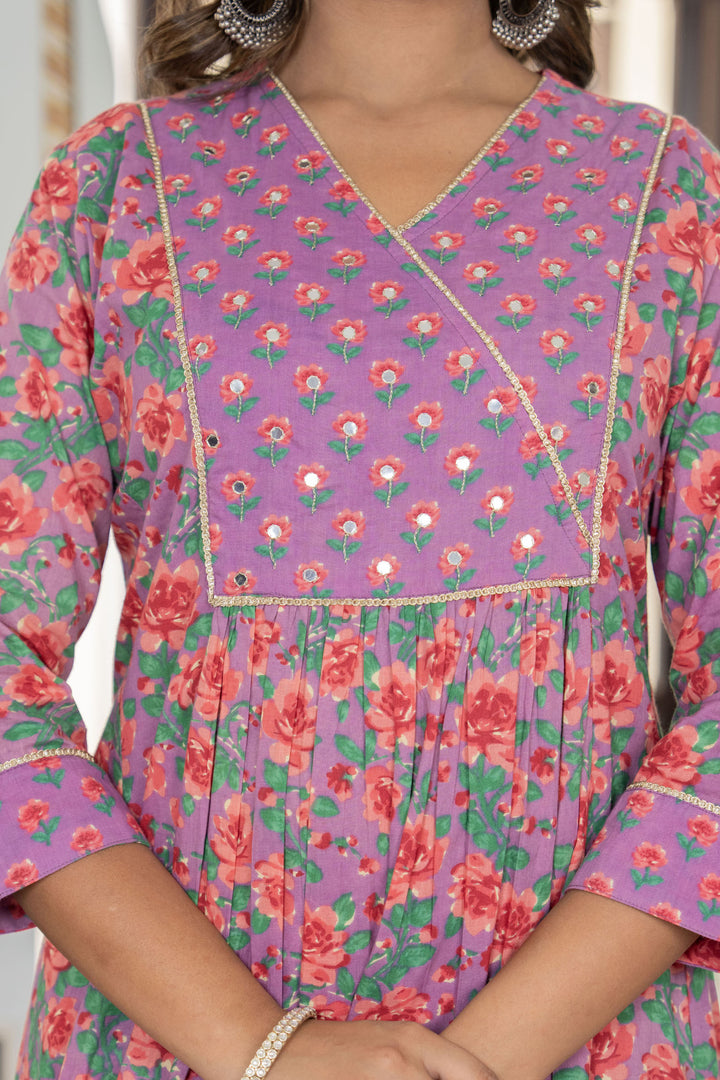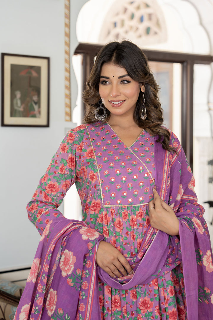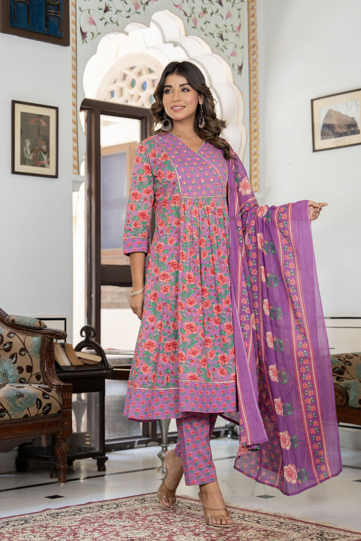 Purple Cotton Floral Printed Kurta Pant Dupatta Set